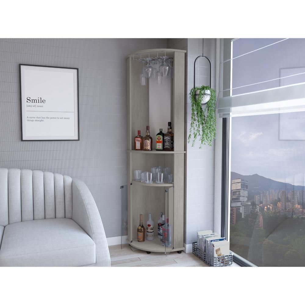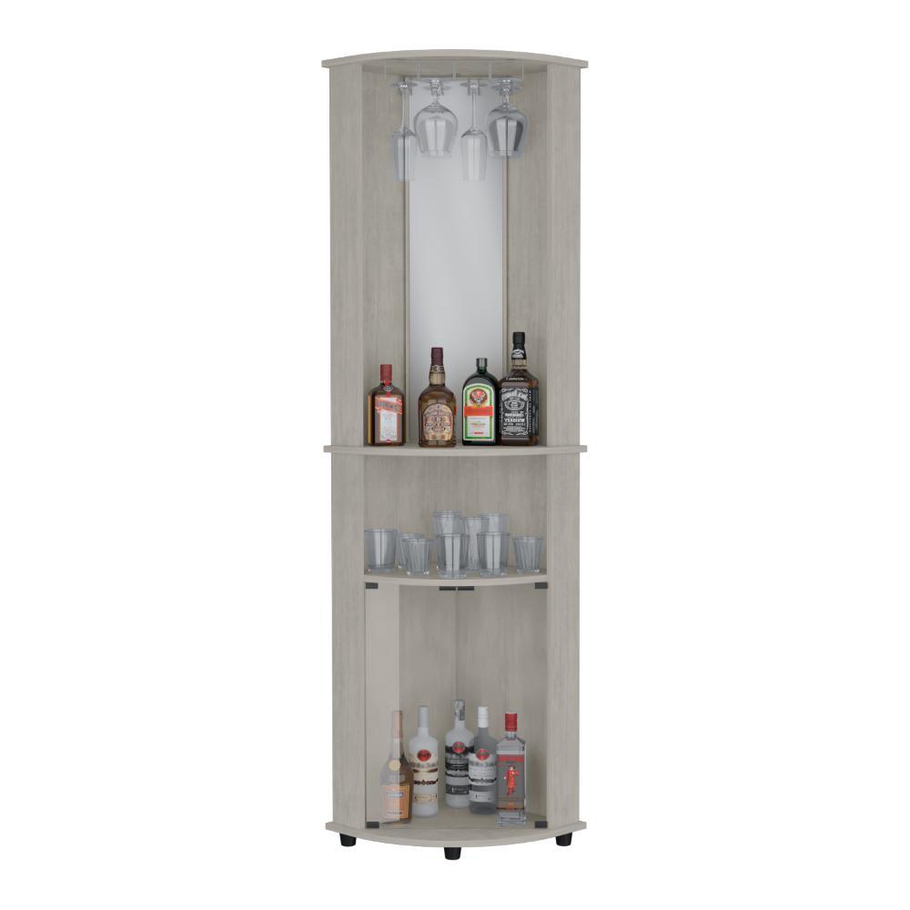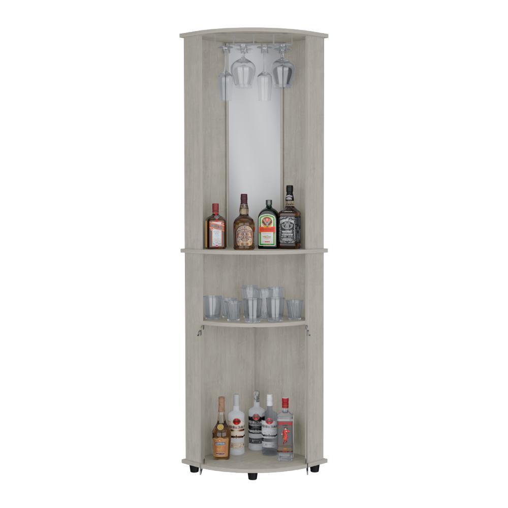 Bar, con colgador de copas, dos puertas de vidrio, espejo, espacio para almacenar botellas y objetos del bar.