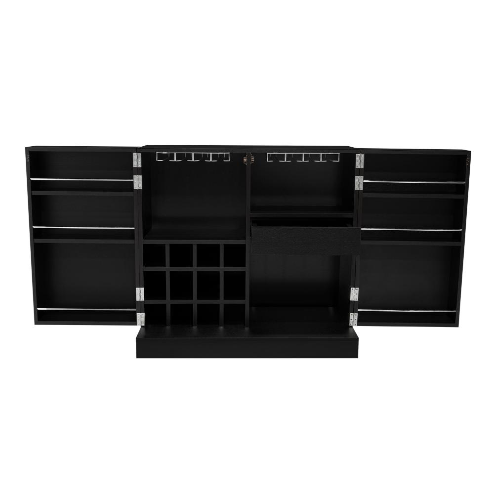 Bar, con cajón para guardar utensilios de bar, porta copas metálico, espacio inferior para organizar vinos.