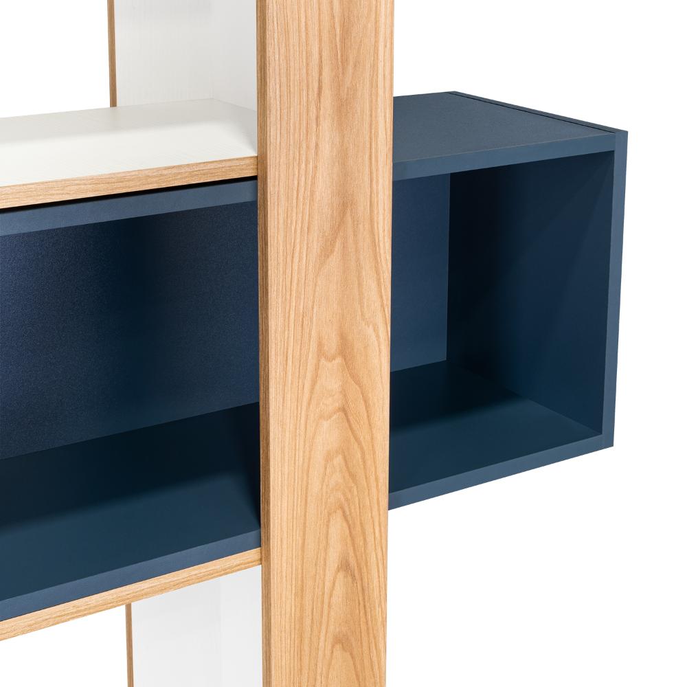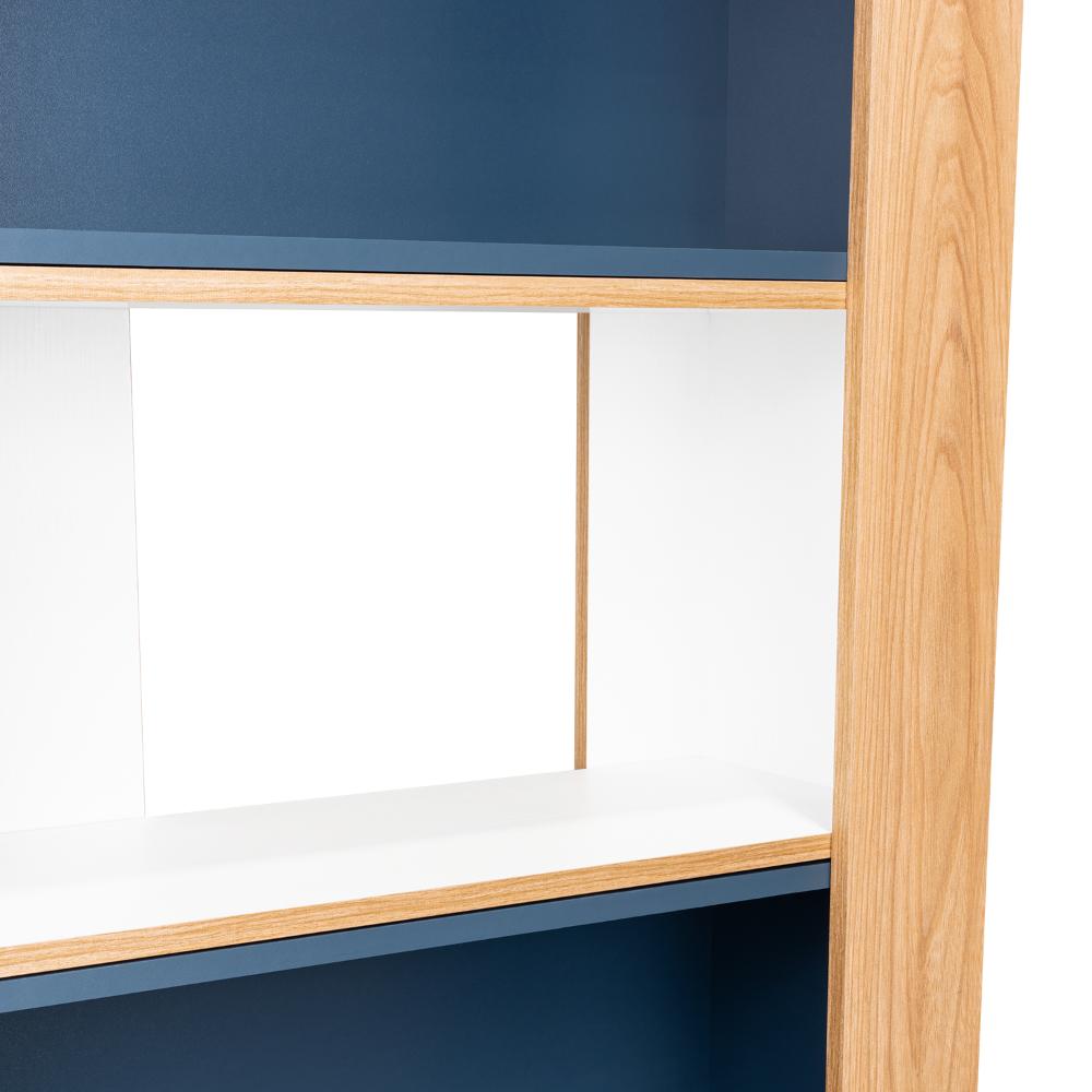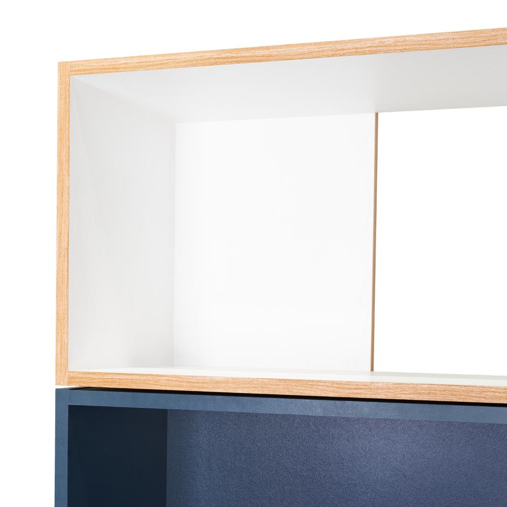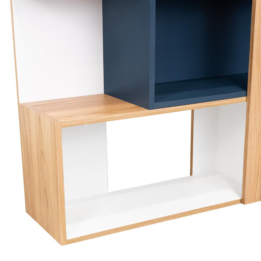 Elaborado en Madera aglomerada MDP, recubierta con láminas melamínicas de excelente calidad, en color Fresno Europeo y Blanco Kronos Azul.