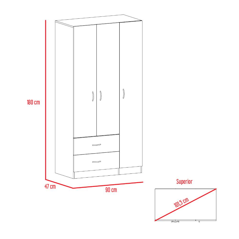 Closet, con 3 puertas batientes, 2 cajones organizadores, 1 tubo cromado para colgar ropa, amplios espacios para guardar ropa y otros elementos.