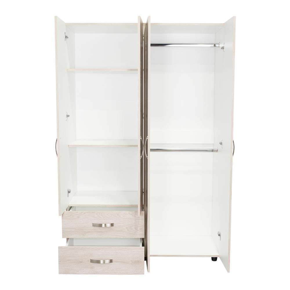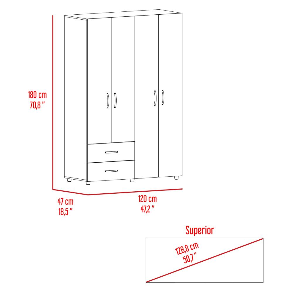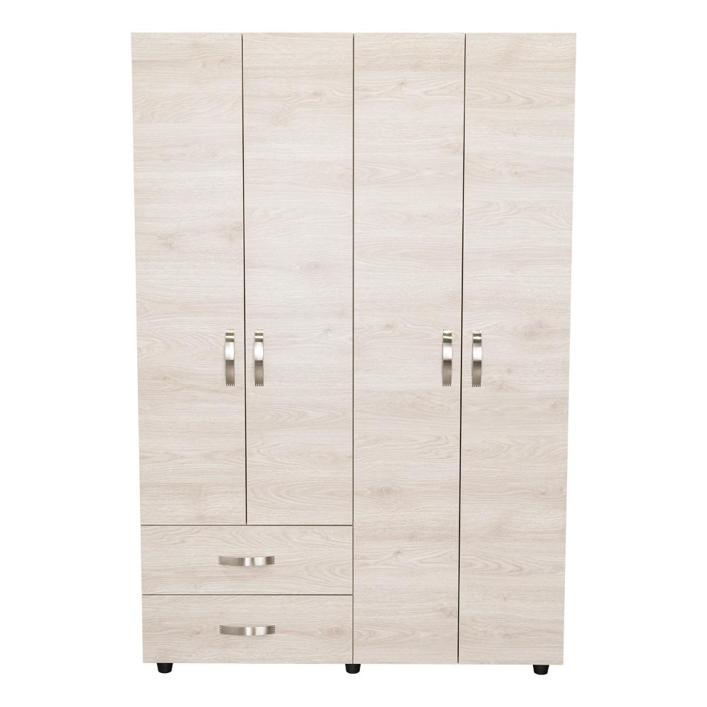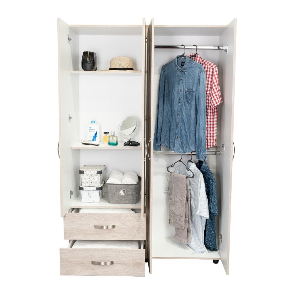 Closet, con 2 tubos cromados para colgar ropa, 2 cajones organizadores, 4 puertas batientes, y varios entrepaños.