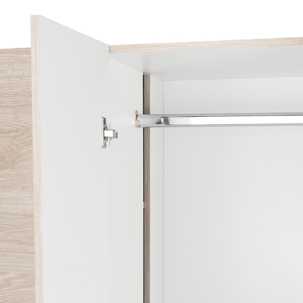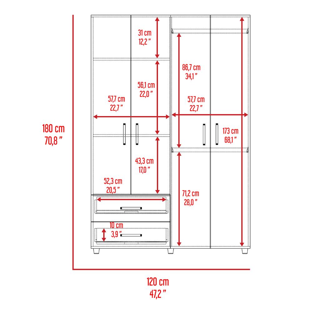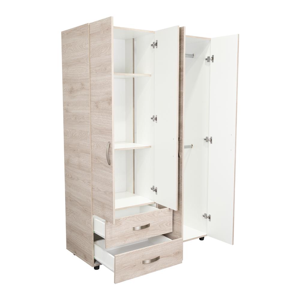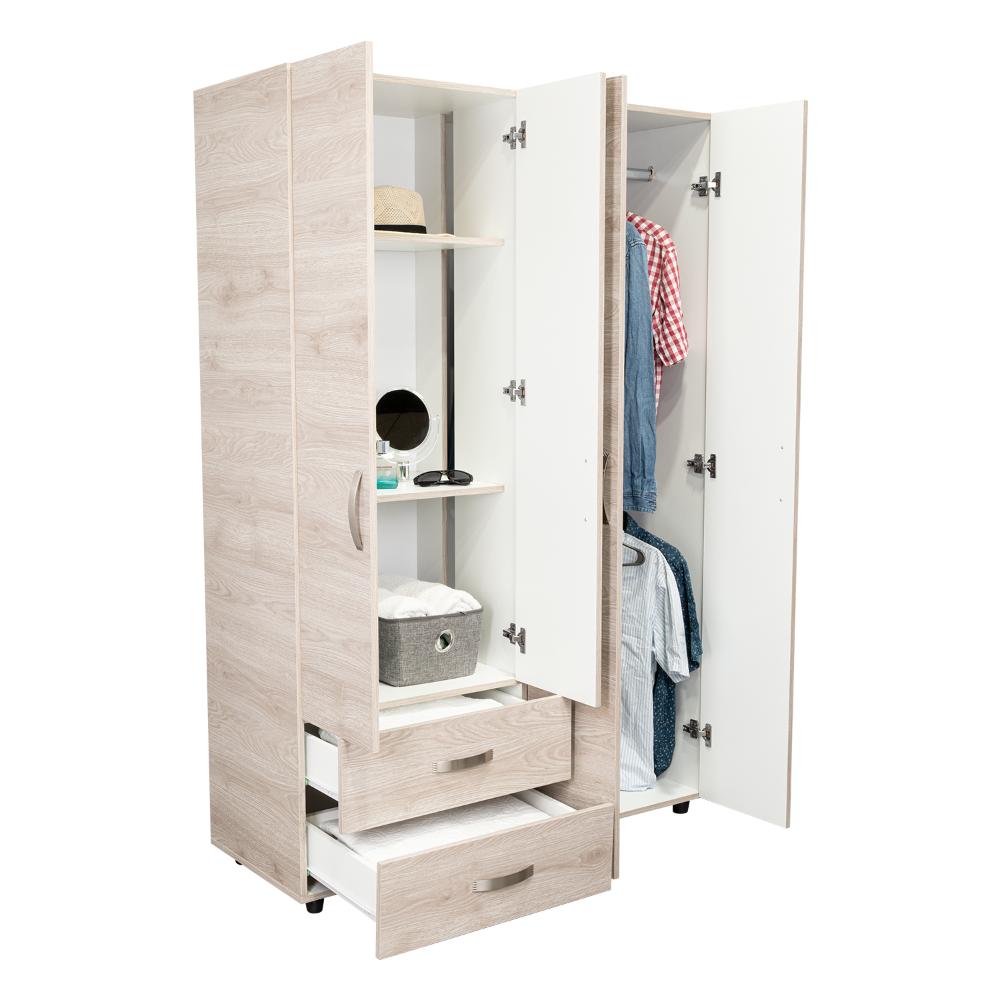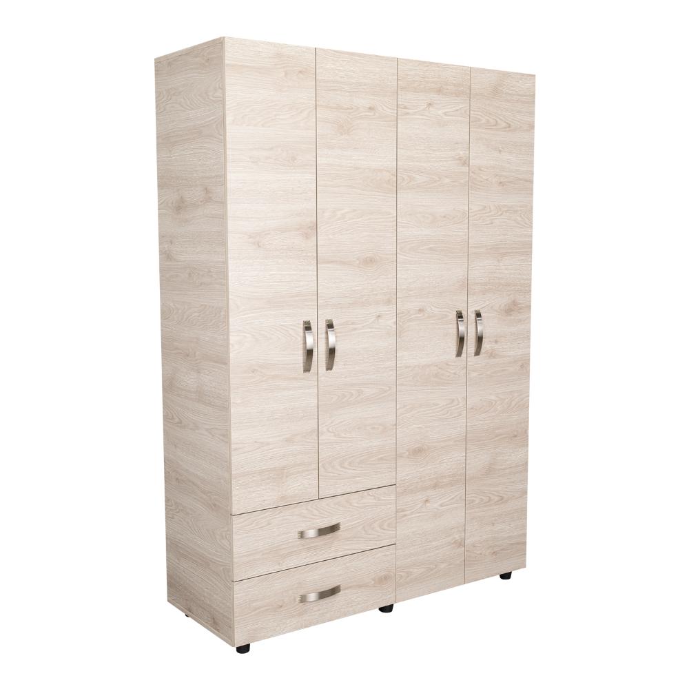 Closet, con 2 tubos cromados para colgar ropa, 2 cajones organizadores, 4 puertas batientes, y varios entrepaños.