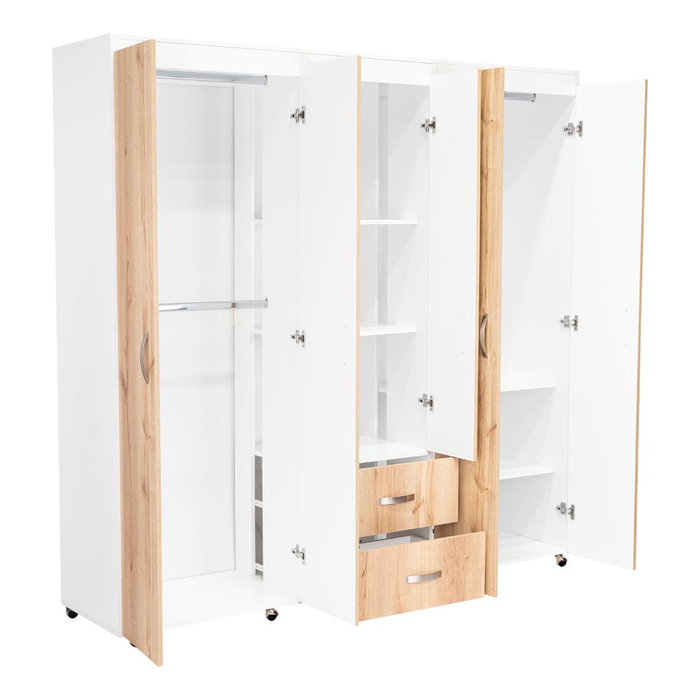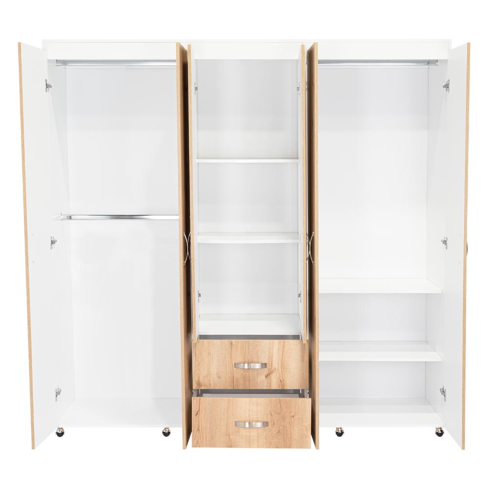 Closet, con amplios espacios y entrepaños para organizar, 6 puertas abatibles, 3 tubos cromados, 2 cajones organizadores, y deslizadores de plástico para apoyo al piso.