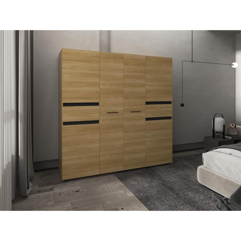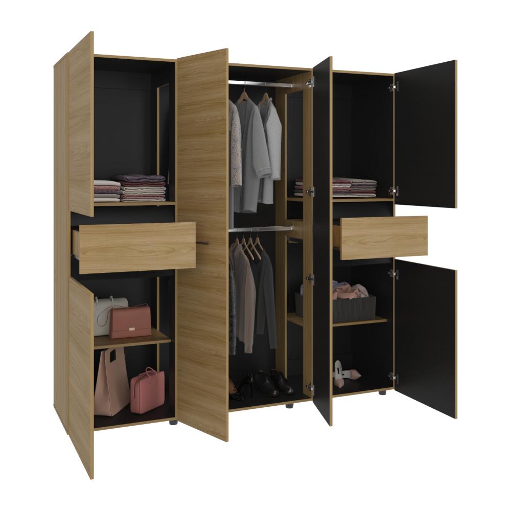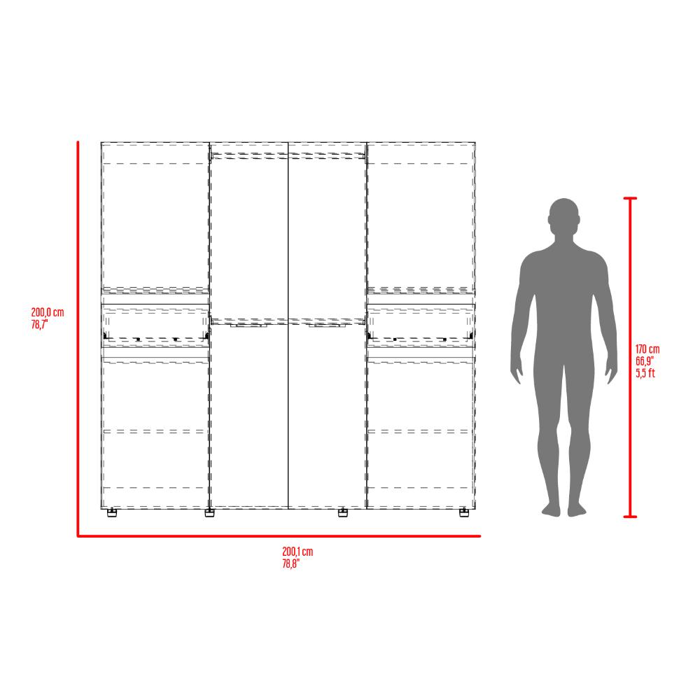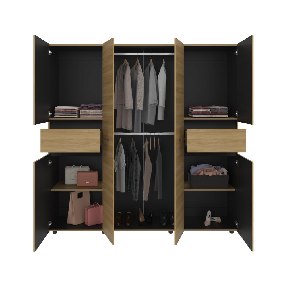 Closet, con seis puertas batientes, dos cajones, dos tubos para colgar ropa y amplios espacios de guardado.