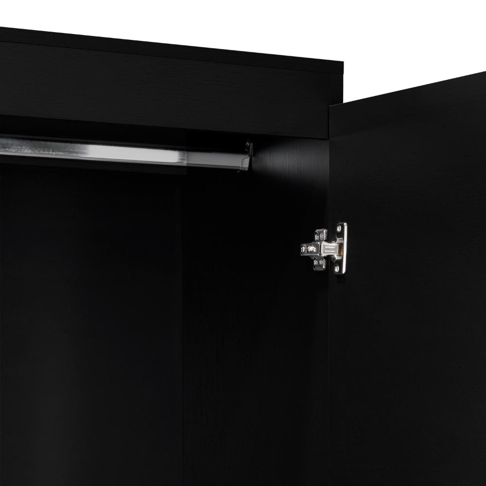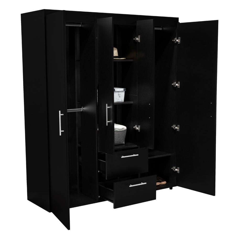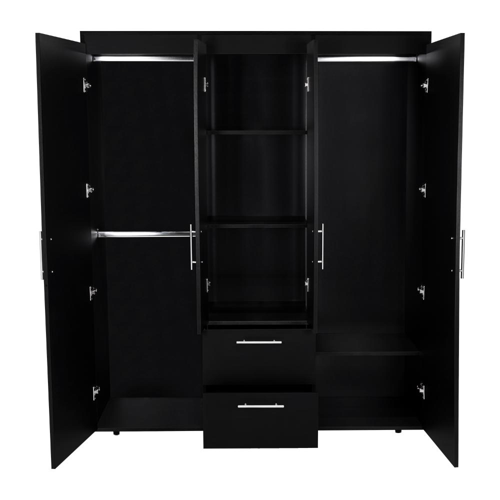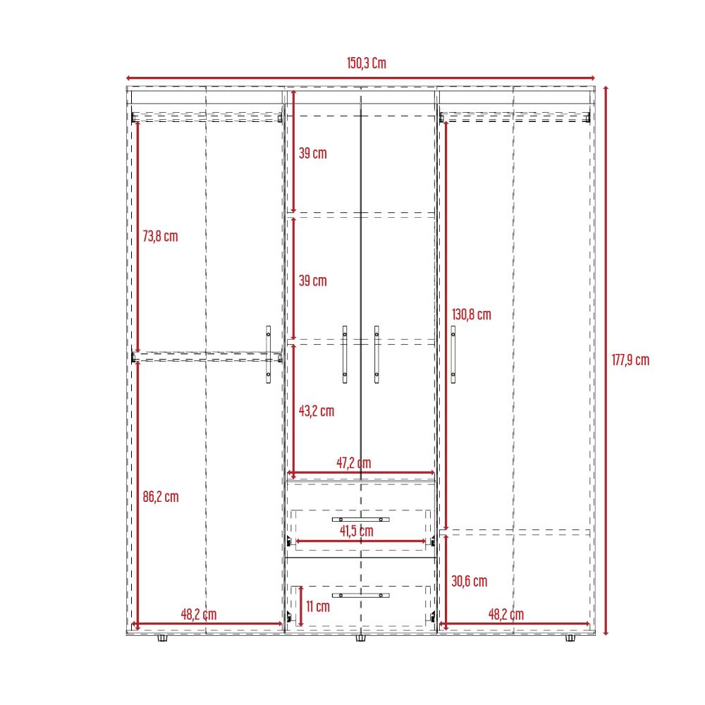 Closet, con 4 puertas batientes, 2 cajones deslizables, 3 tubos pata colgar ropa y amplios espacios de guardado.