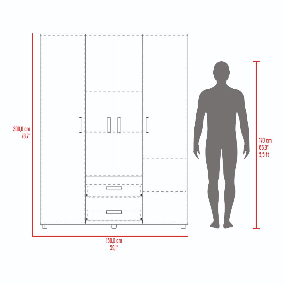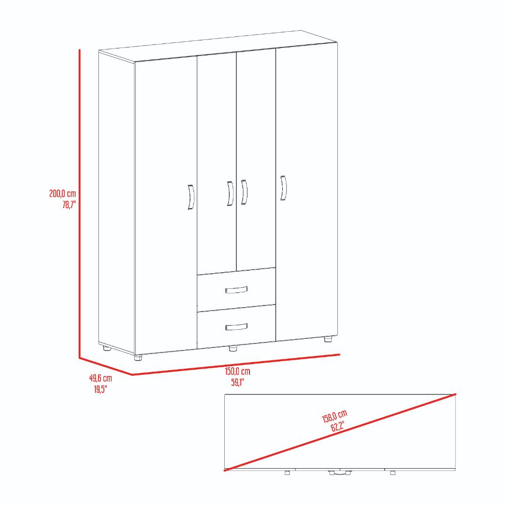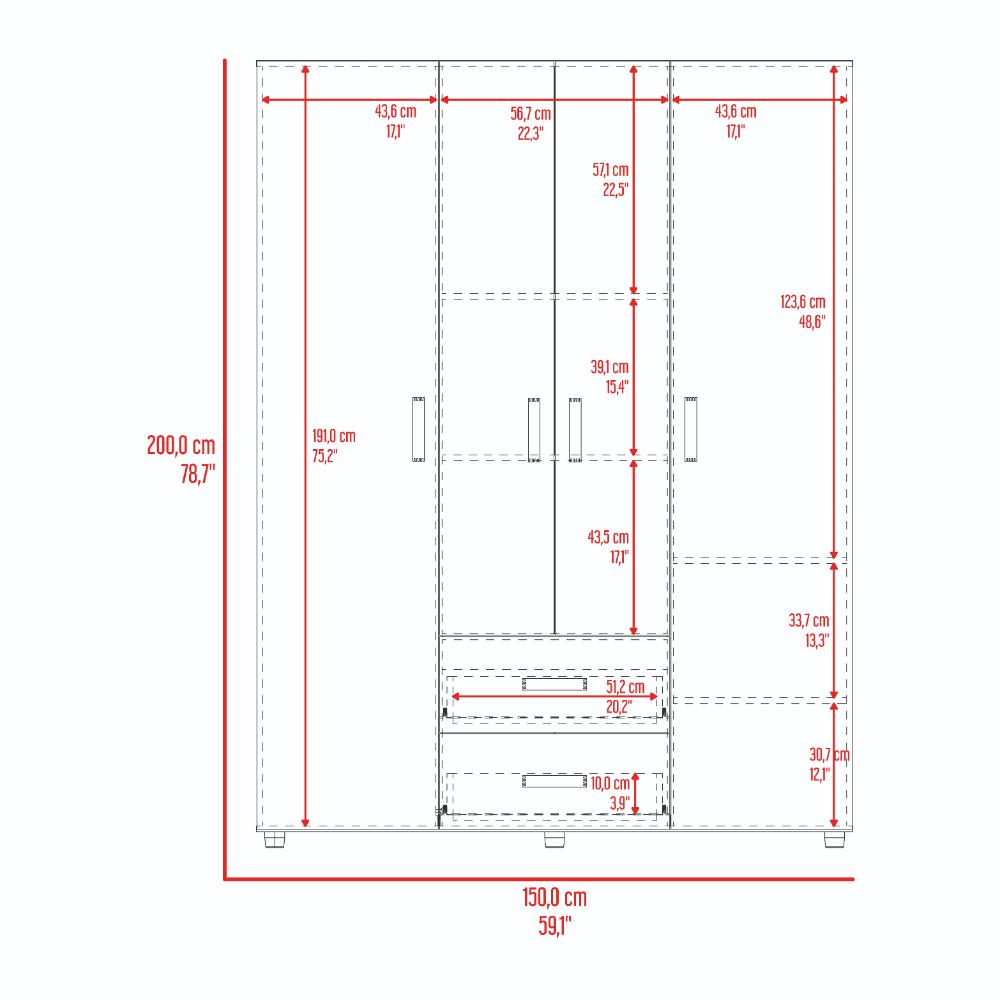 Closet, con amplios espacios y entrepaños para organizar, tres tubos ovalados para colgar ropa, dos cajones organizadores multiusos, manijas metálicas.