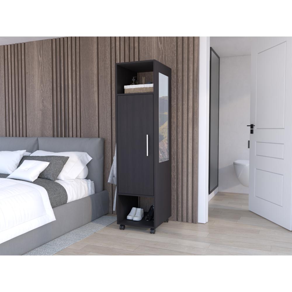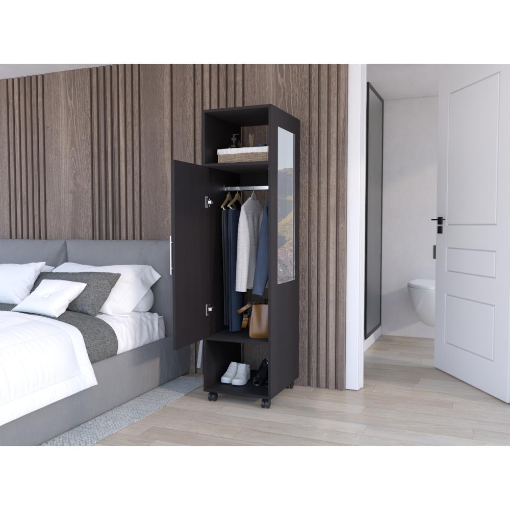 Closet, con tres espacios para guardar ropa, rodachinas con y sin freno para desplazamiento, puerta y un espejo en el lateral.