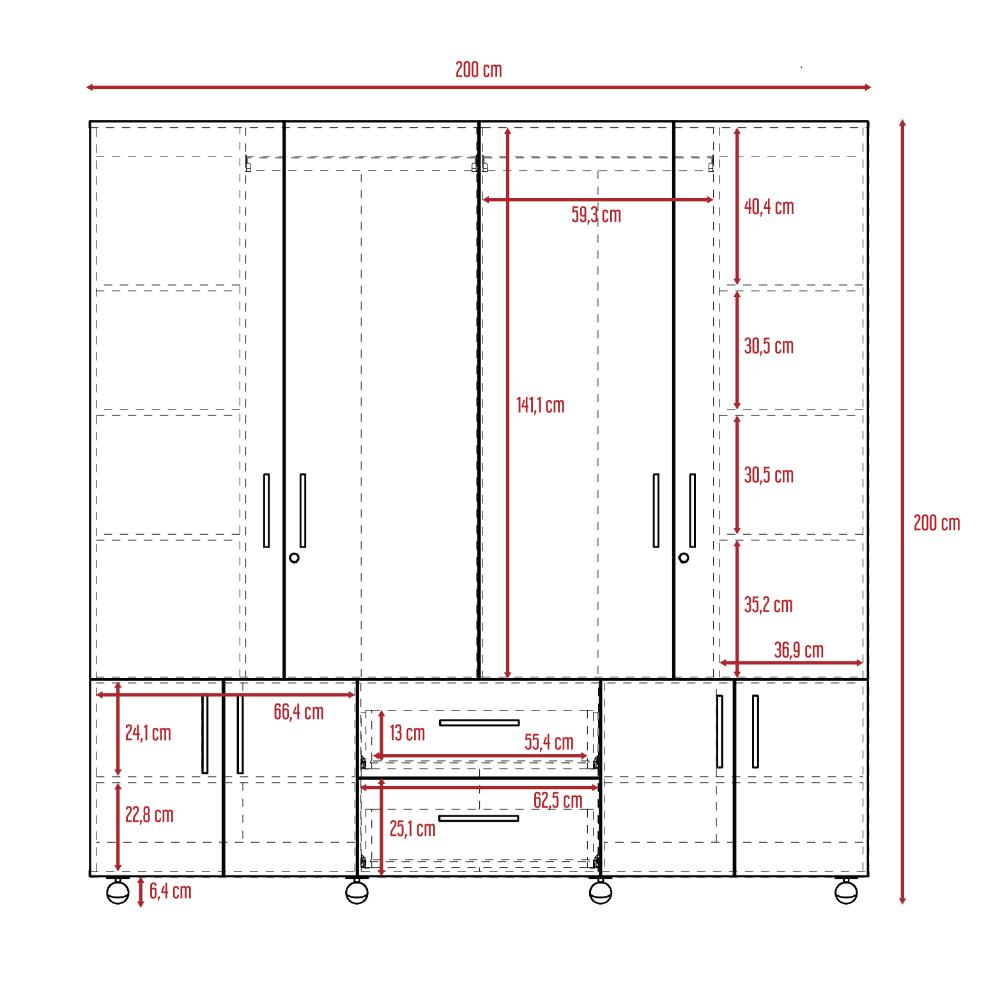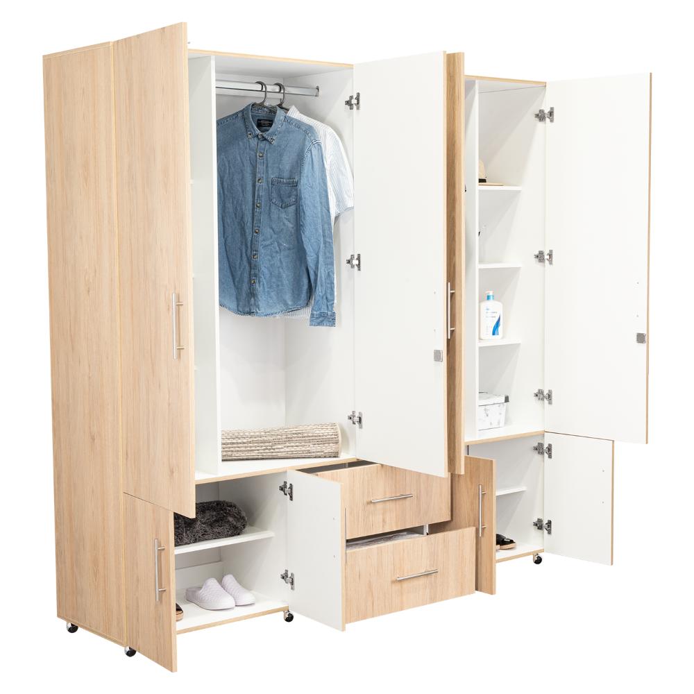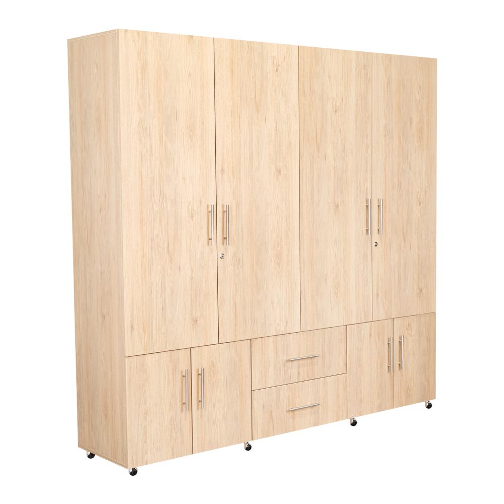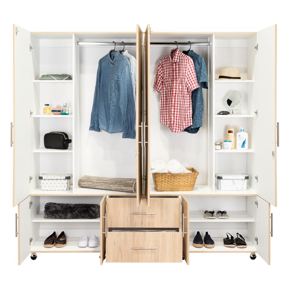 Closet, con 2 cajones, 2 tubos cromados para colgar ropa, 8 puertas batientes con manijas metálicas, variedad de entrepaños, rodachines para fácil desplazamiento, y amplios espacios para guardar ropa, zapatos y/o accesorios.