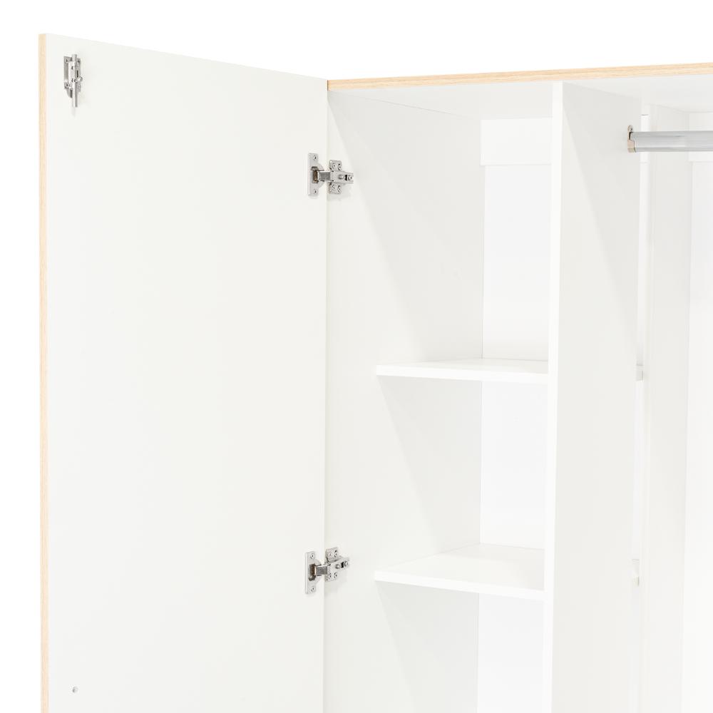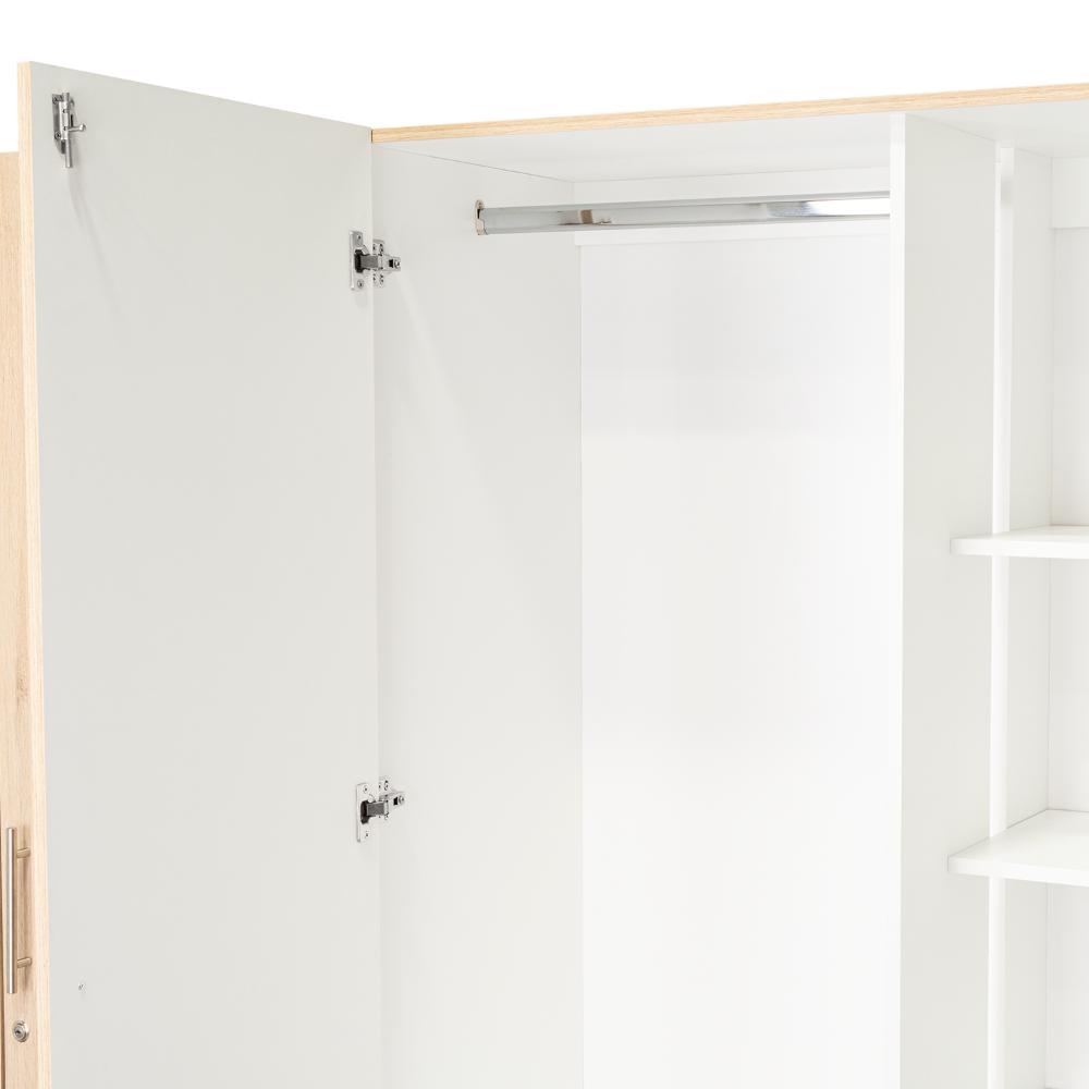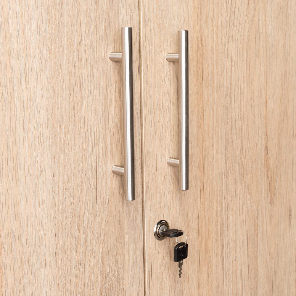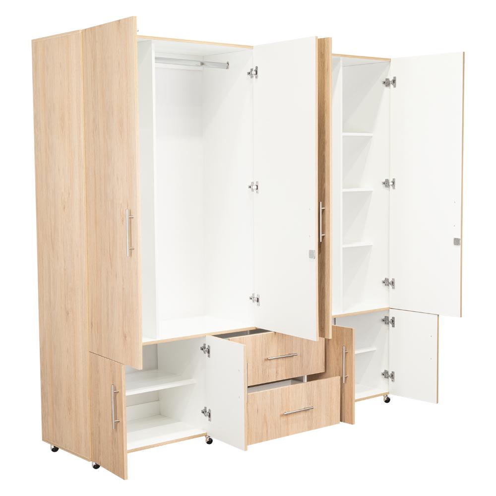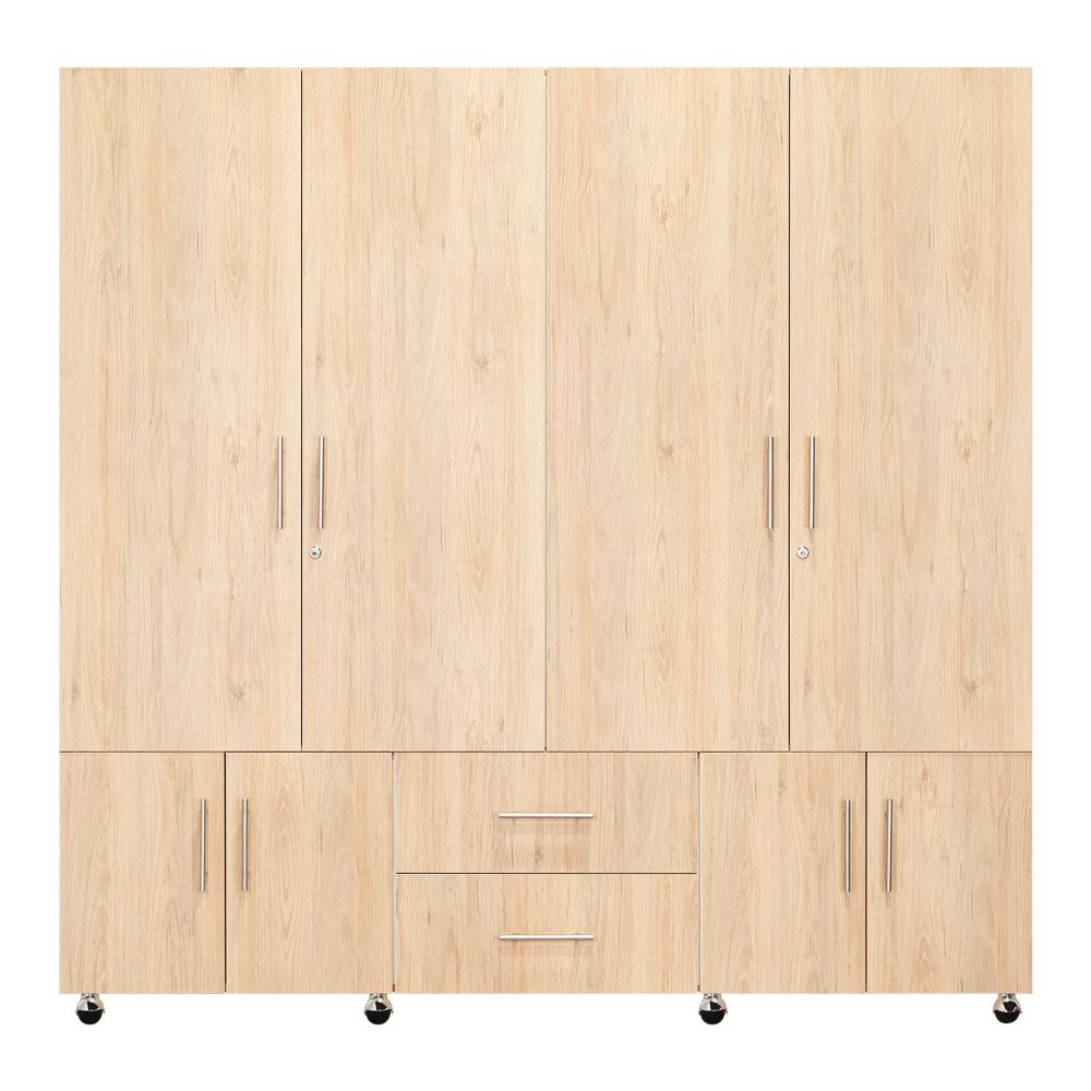 Closet, con 2 cajones, 2 tubos cromados para colgar ropa, 8 puertas batientes con manijas metálicas, variedad de entrepaños, rodachines para fácil desplazamiento, y amplios espacios para guardar ropa, zapatos y/o accesorios.