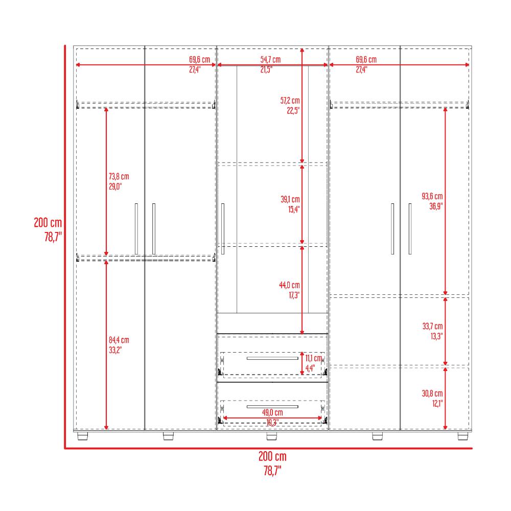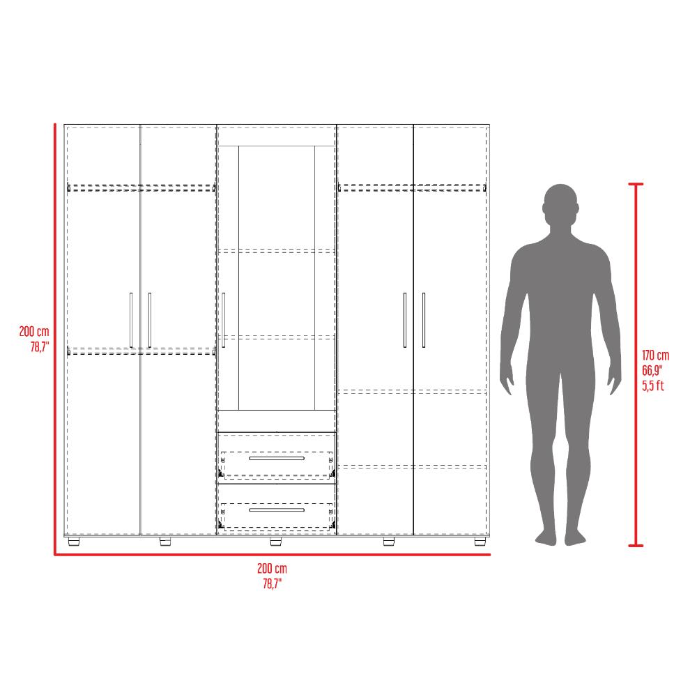 Closet, con cinco puertas abatibles, tres tubos ovalados para colgar ropa, dos cajones organizadores multiusos, amplios espacios para guardar ropa, espejo en puerta.