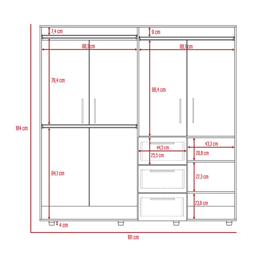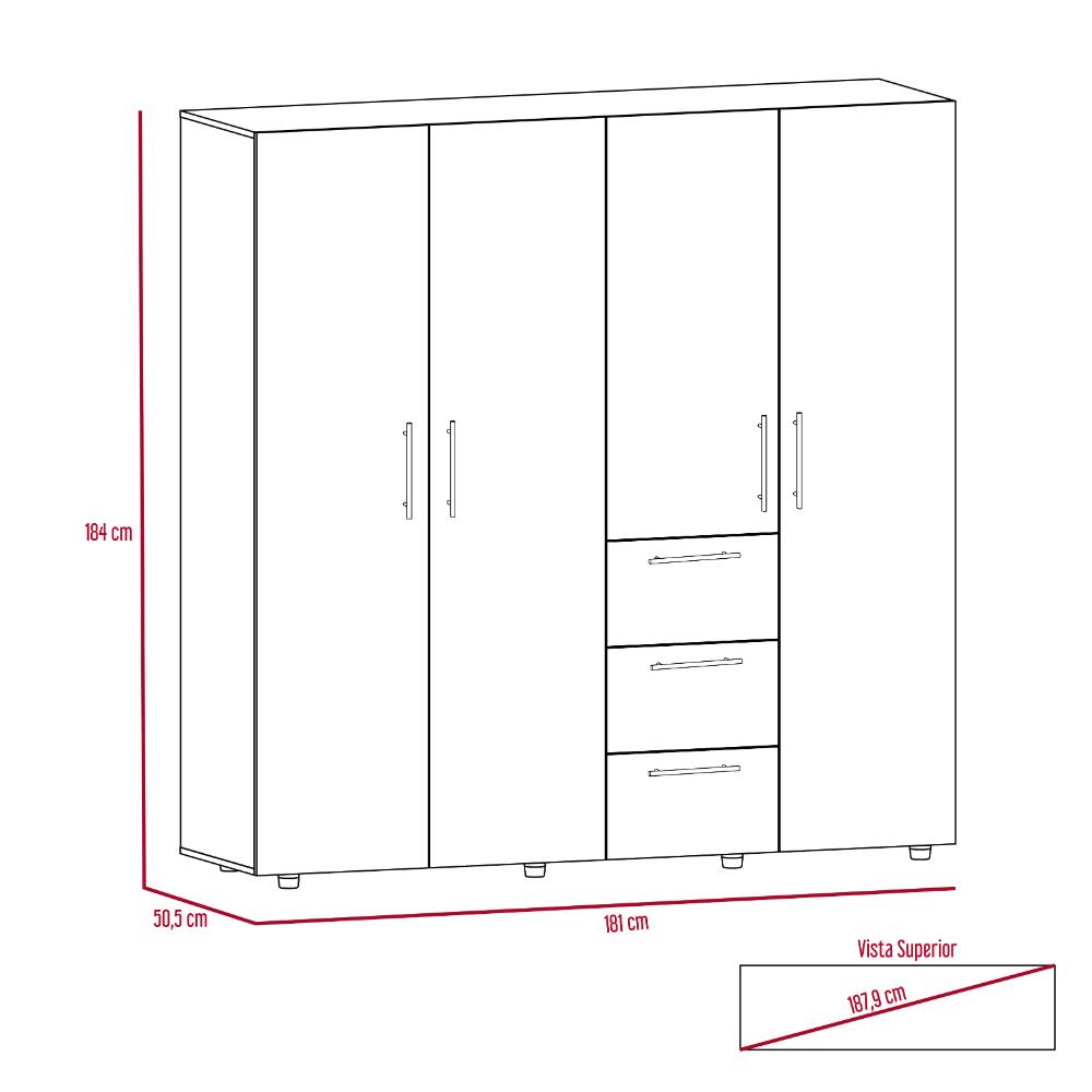 Closet , con 3 tubo cromados, 3 entrepaños, 3 cajones y 4 puertas batientes.