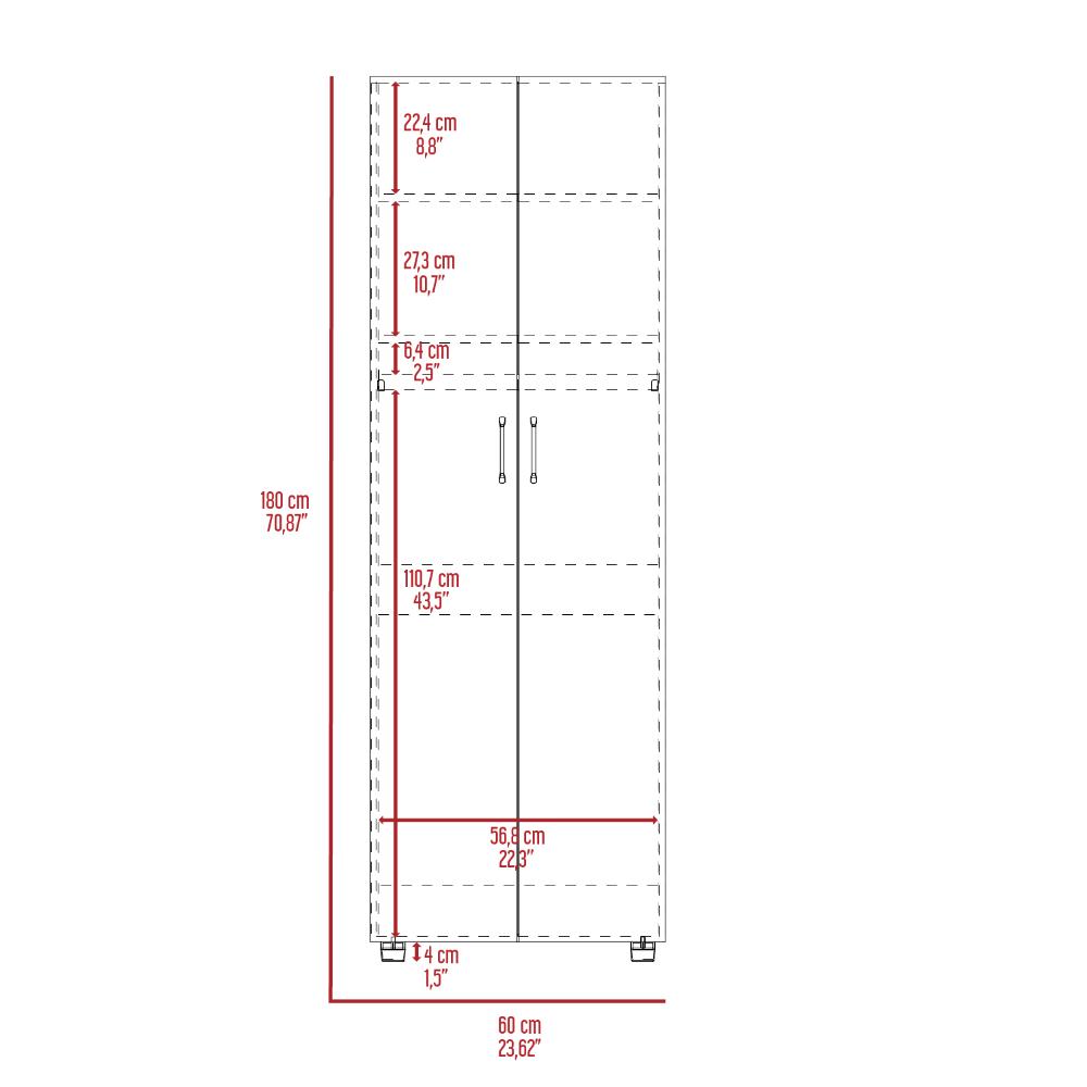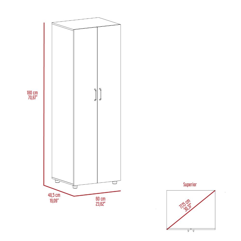 Closet, con 2 puertas abatibles, 2 tubos para colgar prendas, y 3 entrepaños para organizar.