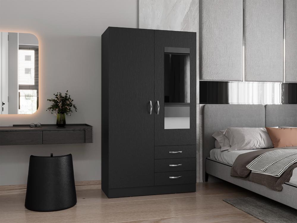 Closet, con 2 puertas abatibles, 3 cajones, cuenta con diversos espacio para ropa y accesorios, incluye espejo con medidas de 90x30 cm, y es de facil instalación.