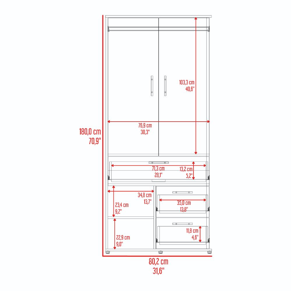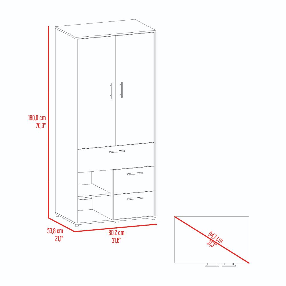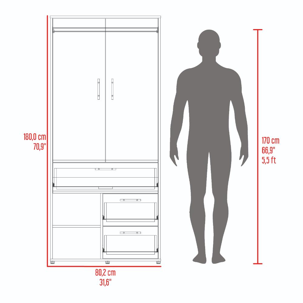 Closet, con amplio espacio interno para guardar ropa e implementos personales, dos puertas abatibles y tres cajones, diseño moderno.