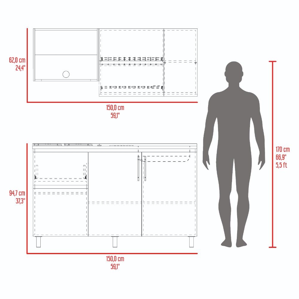 Cocina Integral, con modulo superior con 3 puertas abatibles, incluye locero y vasera, cuenta con espacio para almacenar alimentos y espacio para campana y microondas, en el modulo inferior cuenta con 3 puertas abatibles, 1 cajón, manijas, patas metálicas e incluye mesón derecho. *INCLUYE MESÓN*