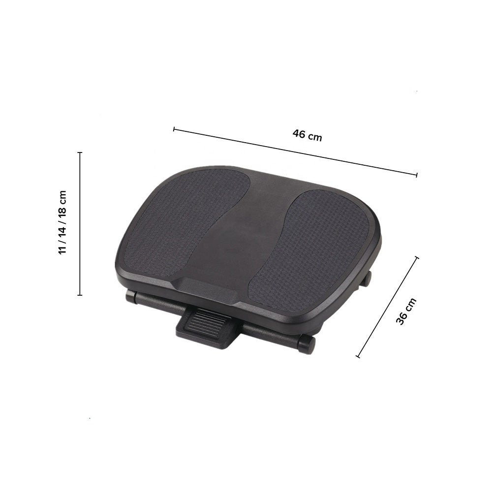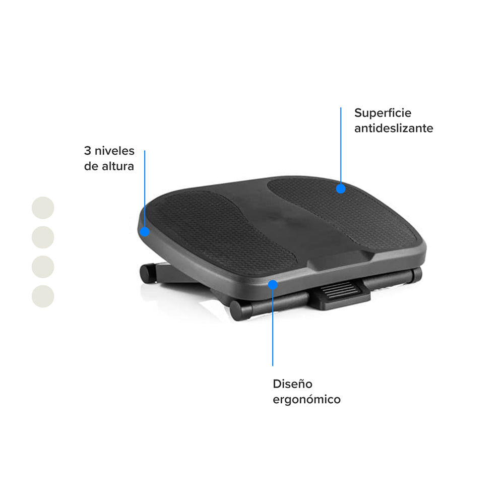 Prioriza tu comodidad con nuestro descansapies de 3 alturas. Es un accesorio de oficina ideal para tus largas jornadas de trabajo. Su diseño ergonómico te permitirá reducir la tensión y la fatiga en tus piernas y pies, cuidando tu salud y brindando el confort que tanto buscas. Su plataforma flotante te permitirá ejercitar los tobillos mientras estas frente a tu pc. Podrás ajustar su altura según tus necesidades y preferencias, posee tres niveles regulables. Fabricado con materiales de alta calidad para asegurar su resistencia y durabilidad.