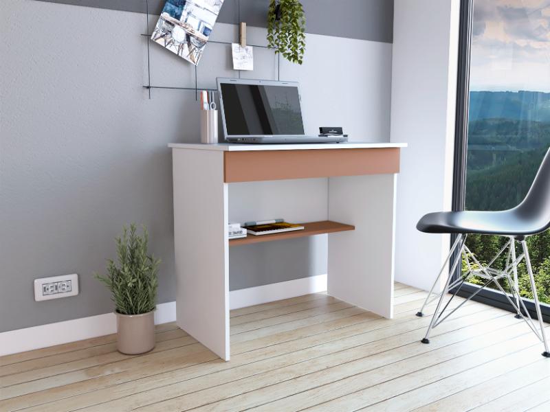 Escritorio con diseño moderno, amplia superficie de trabajo, entrepaño y cajon.