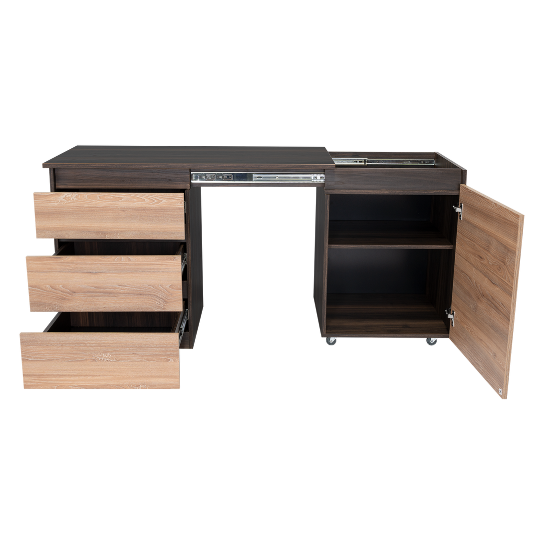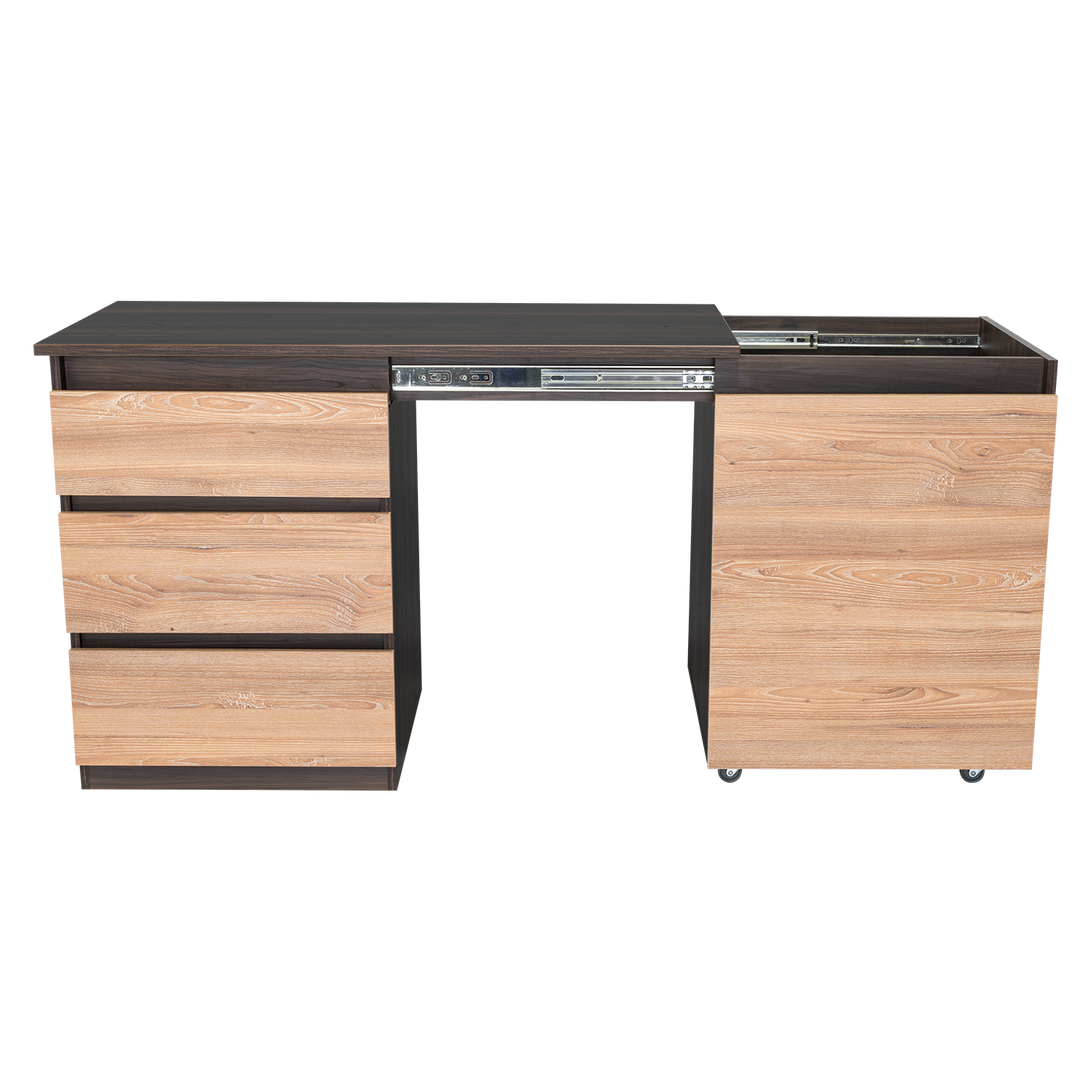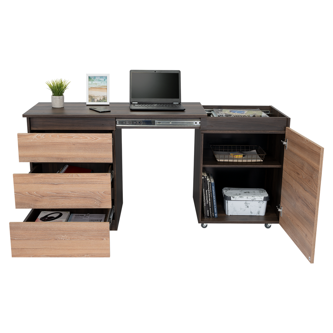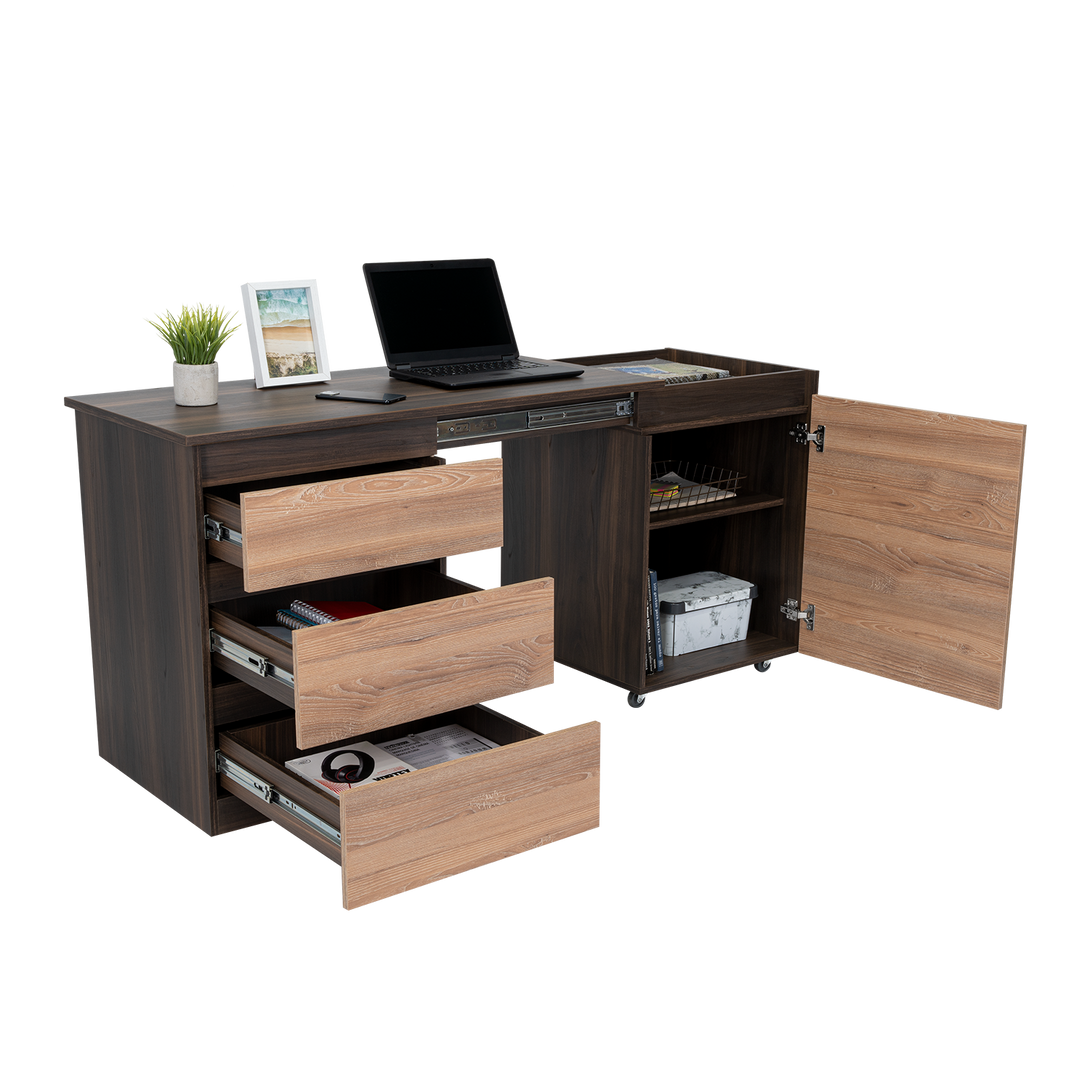 Escritorio, con modulo derecho movil que permite cambiar funcionalidad del mueble, tres cajones de extencion total