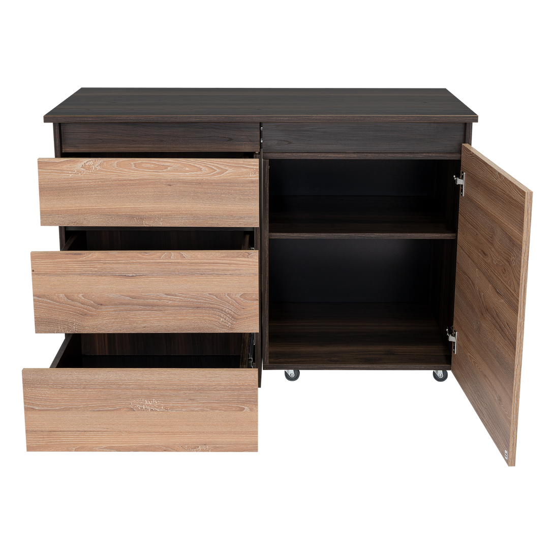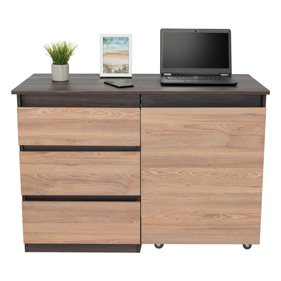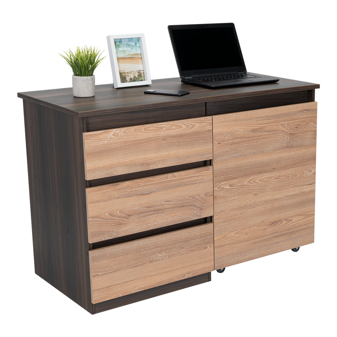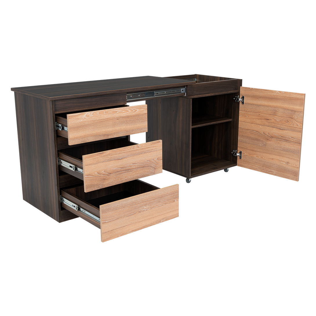 Escritorio, con modulo derecho movil que permite cambiar funcionalidad del mueble, tres cajones de extencion total