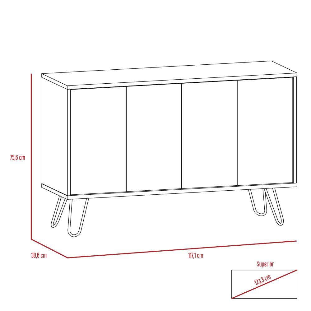 Mesa Auxiliar, con amplio espacio para botellas, copas, 4 puertas batientes y patas metálicas.