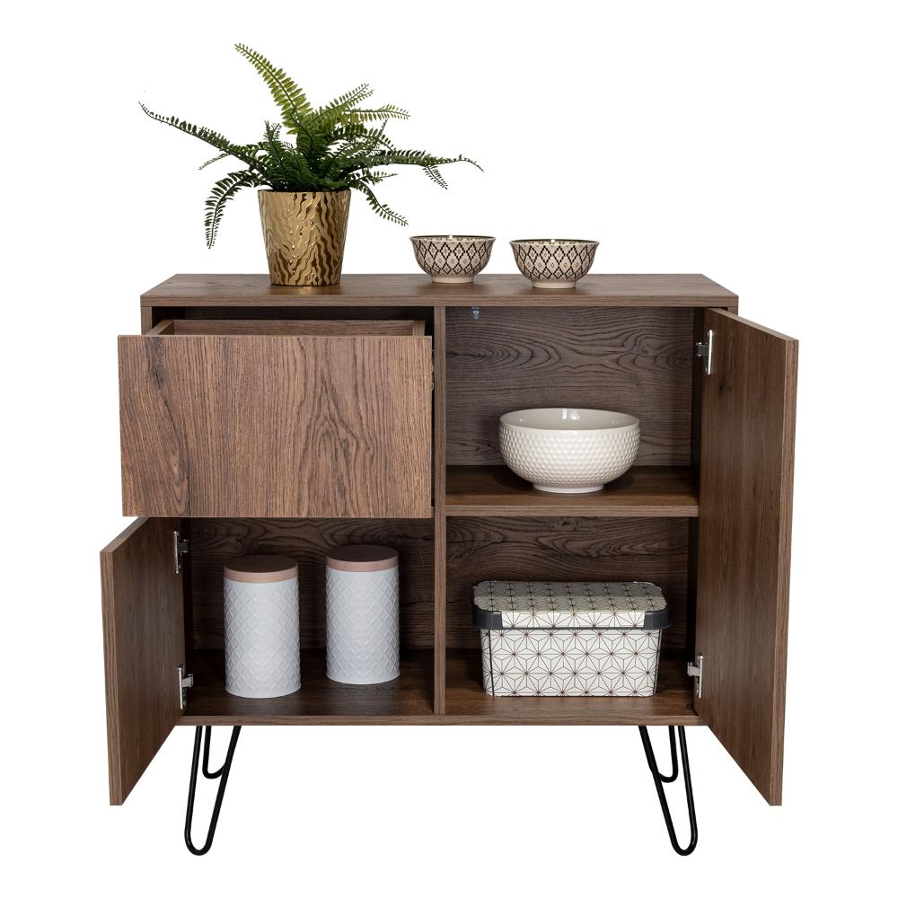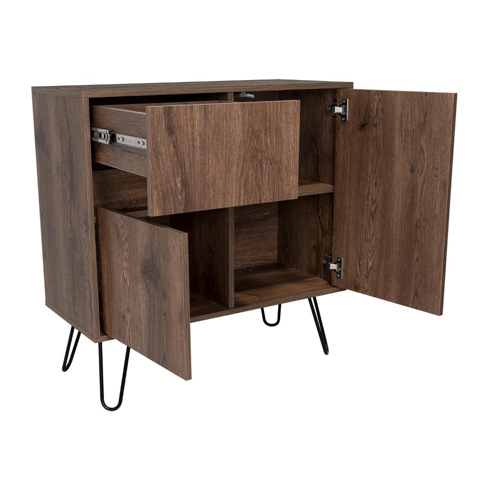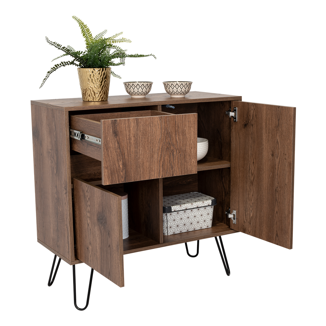Mesa Auxiliar con espacio para colocar y almacenar objetos, dos puertas y un cajon apertura sin manija, patas metalicas negras.