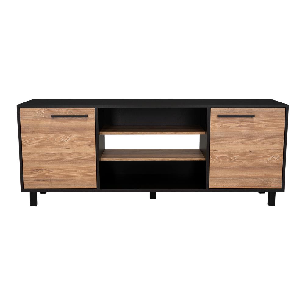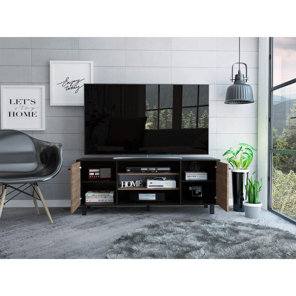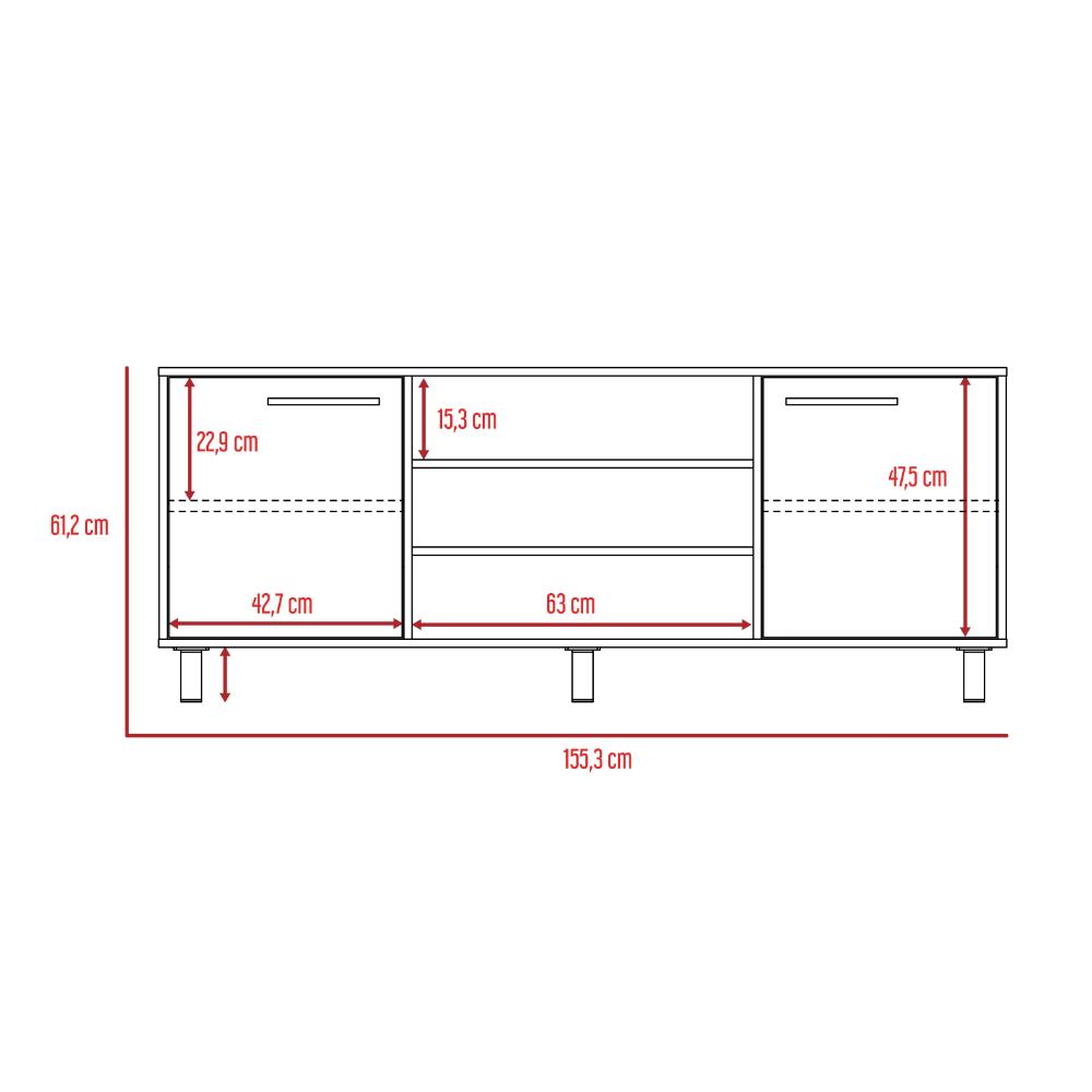Mesa para TV, con espacio para televisor de 65", patas en acero, y espacio inferior para colocar objetos decorativos y equipos de audio y video.
