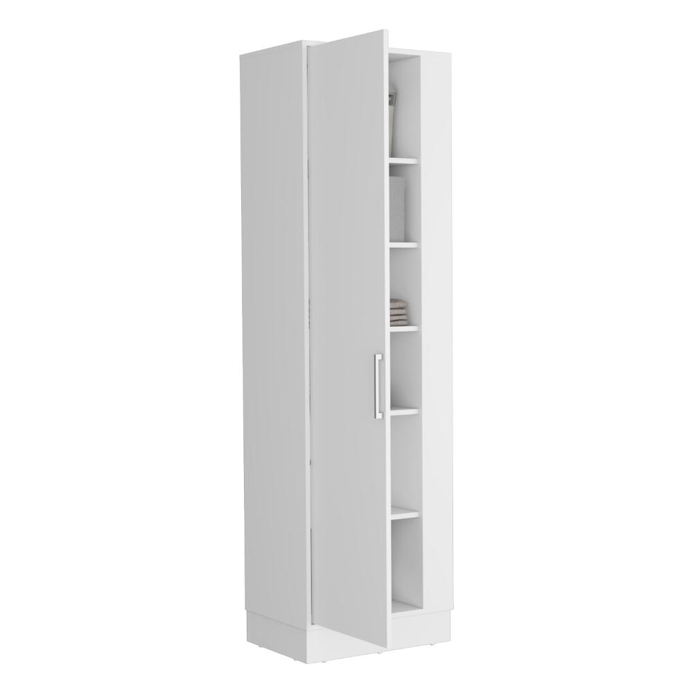 Muebles Aseo con cinco entrepaños, incluye colgadero de escobas, manijas metálicas.
