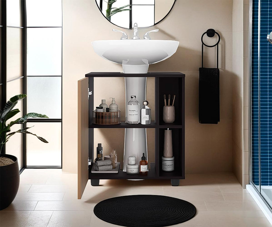 Mueble Lavamanos, de pesdestal moderno, 1 puerta abatible, con espacio para ubicar objetos decorativos y es de facil instalación
