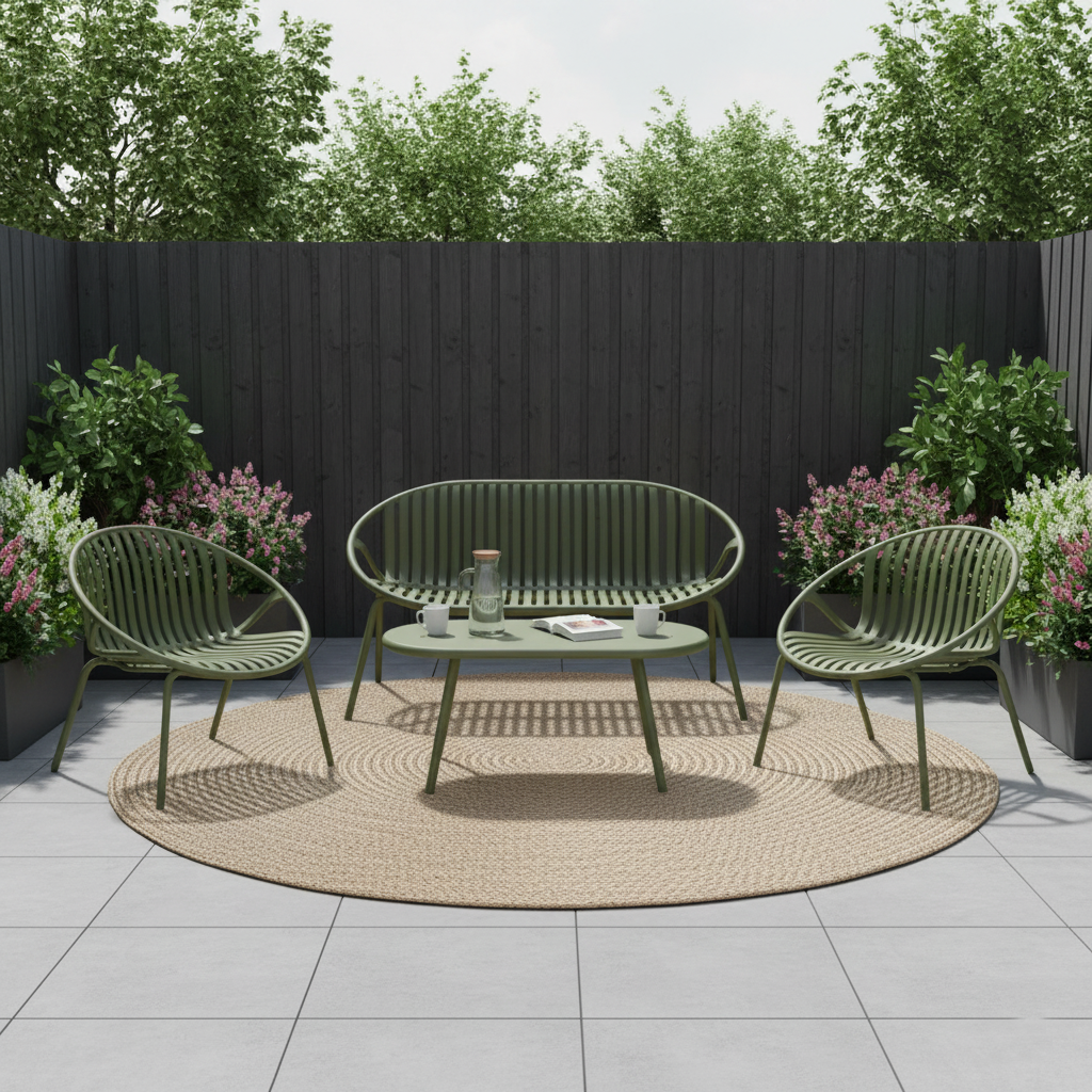 Elaborado en Polipropileno y protección a los rayos UV el set incluye mesa centro, dos sillas y un banco en patas metalicas, en Color Verde Olivo