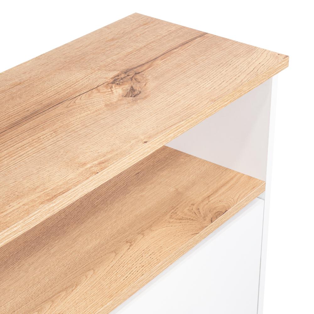 Elaborado en Madera aglomerada MDP, recubierta con láminas melamínicas de excelente calidad, en colorCafé Claro y Blanco Vainilla.